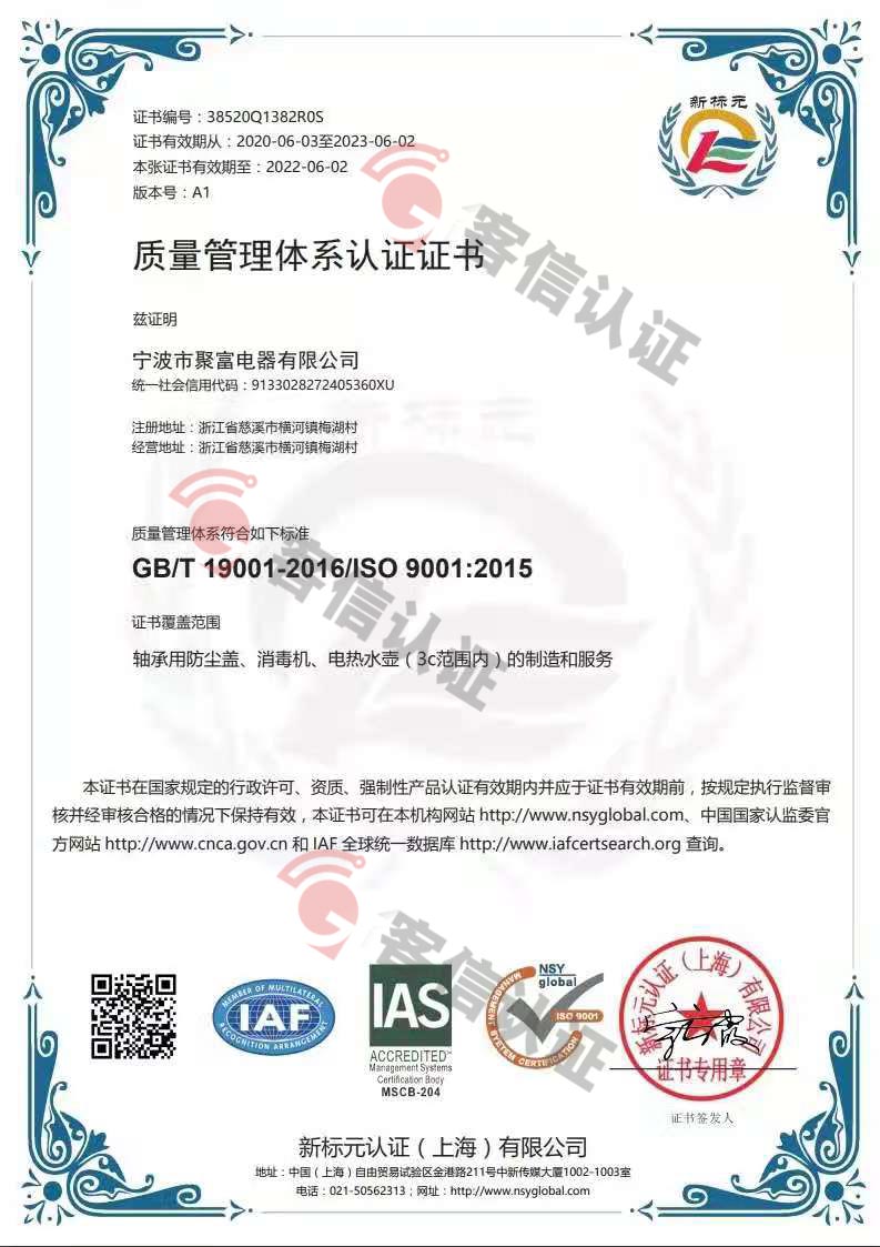 > 恭喜寧波市聚富電器有限公司獲取ISO9000質(zhì)量管理體系證書