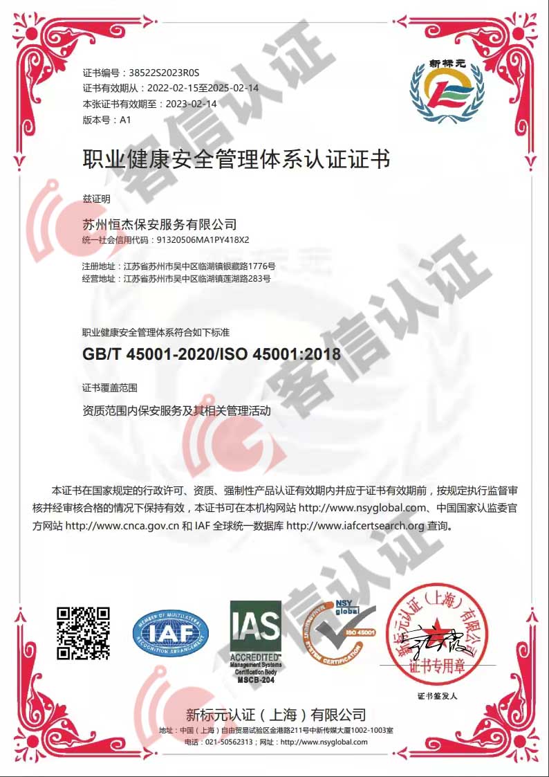 > 恭喜蘇州恒杰保安服務有限公司獲得ISO三體系認證證書